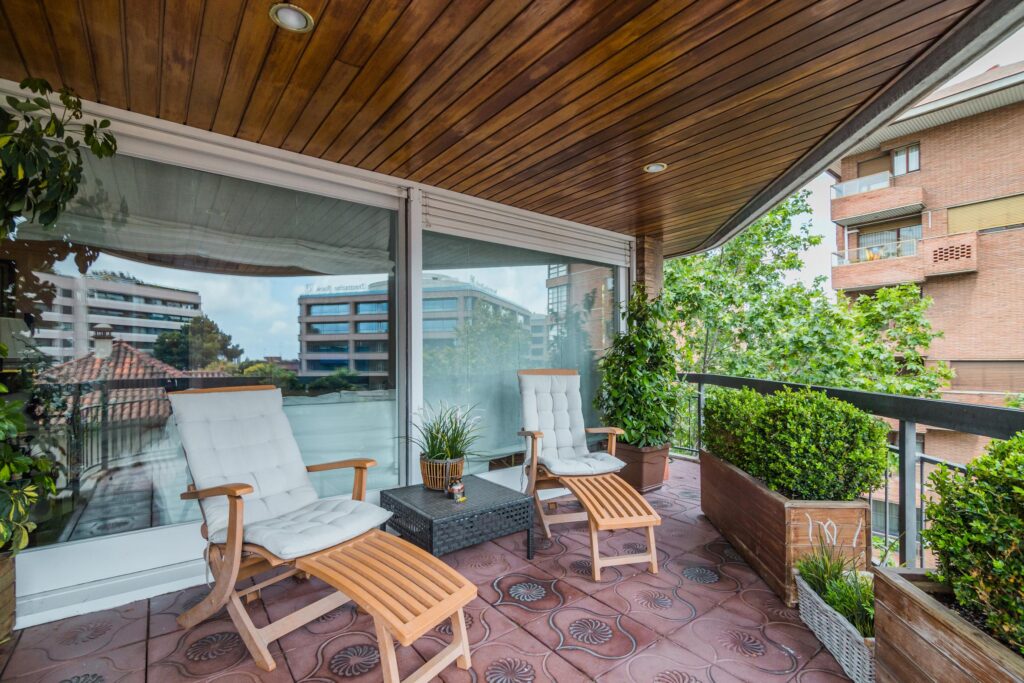 La decoración de los espacios exteriores para crear un ambiente acorde a la personalidad de cada uno es fundamental. Debido a que la terraza es un espacio que suele ser abierto, la elección de mobiliario resistente a las inclemencias del tiempo resulta trascendente. Este tipo de muebles y los de fácil mantenimiento contribuirán a crear un ambiente de descanso. Los sillones especialmente diseñados para las terrazas junto a una mesa de centro o distintas mesas auxiliares establecen un lugar adecuado para reuniones, tiempo de lectura u otra actividad de ocio. Las hamacas de jardín para tomar el sol también son recomendables.