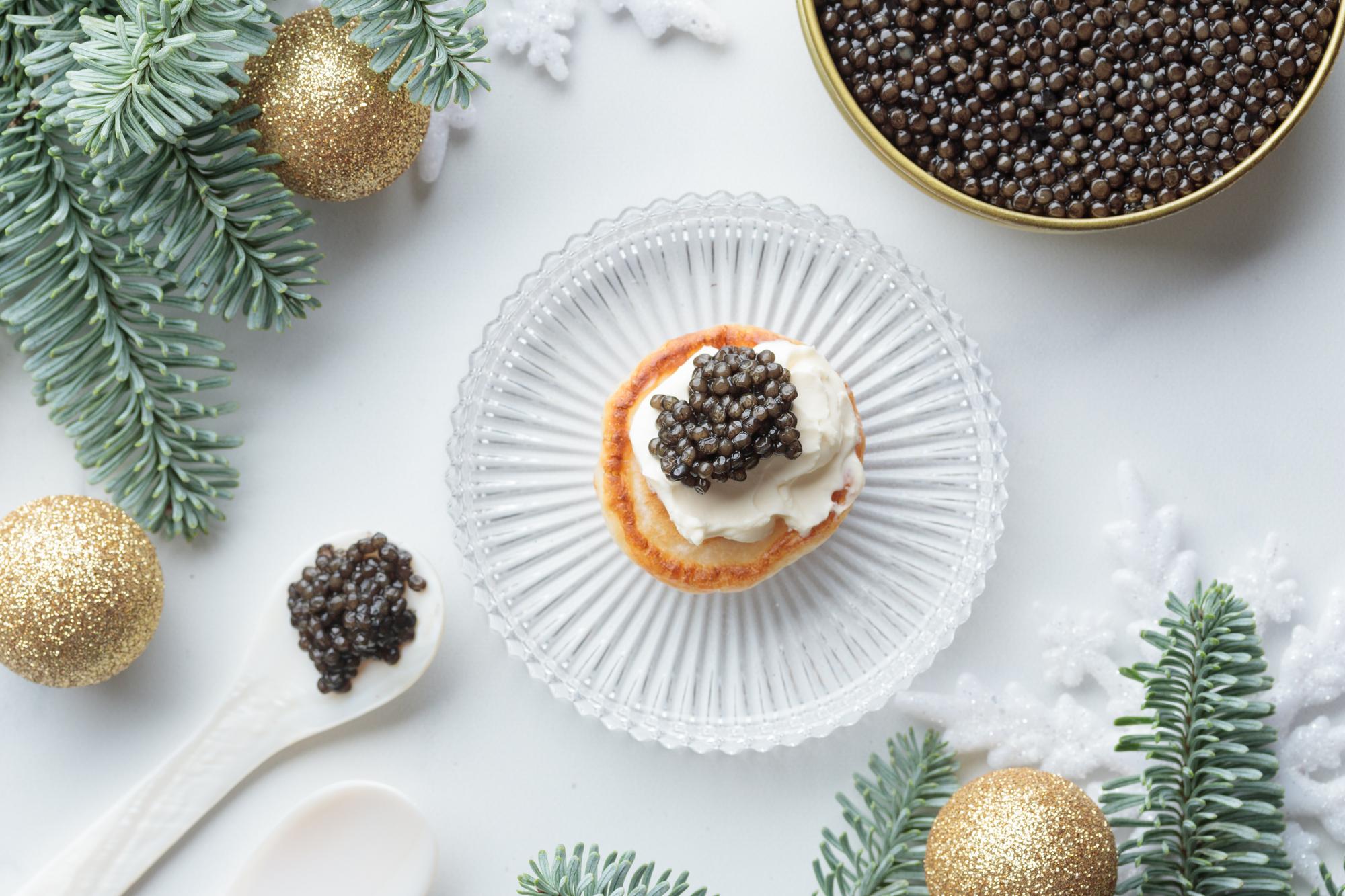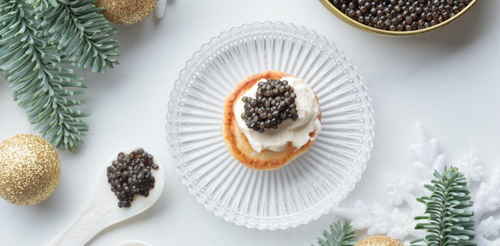 - Entrante: Tartaletas de caviar o blinis caseros con salmón ahumado y crema de eneldo.